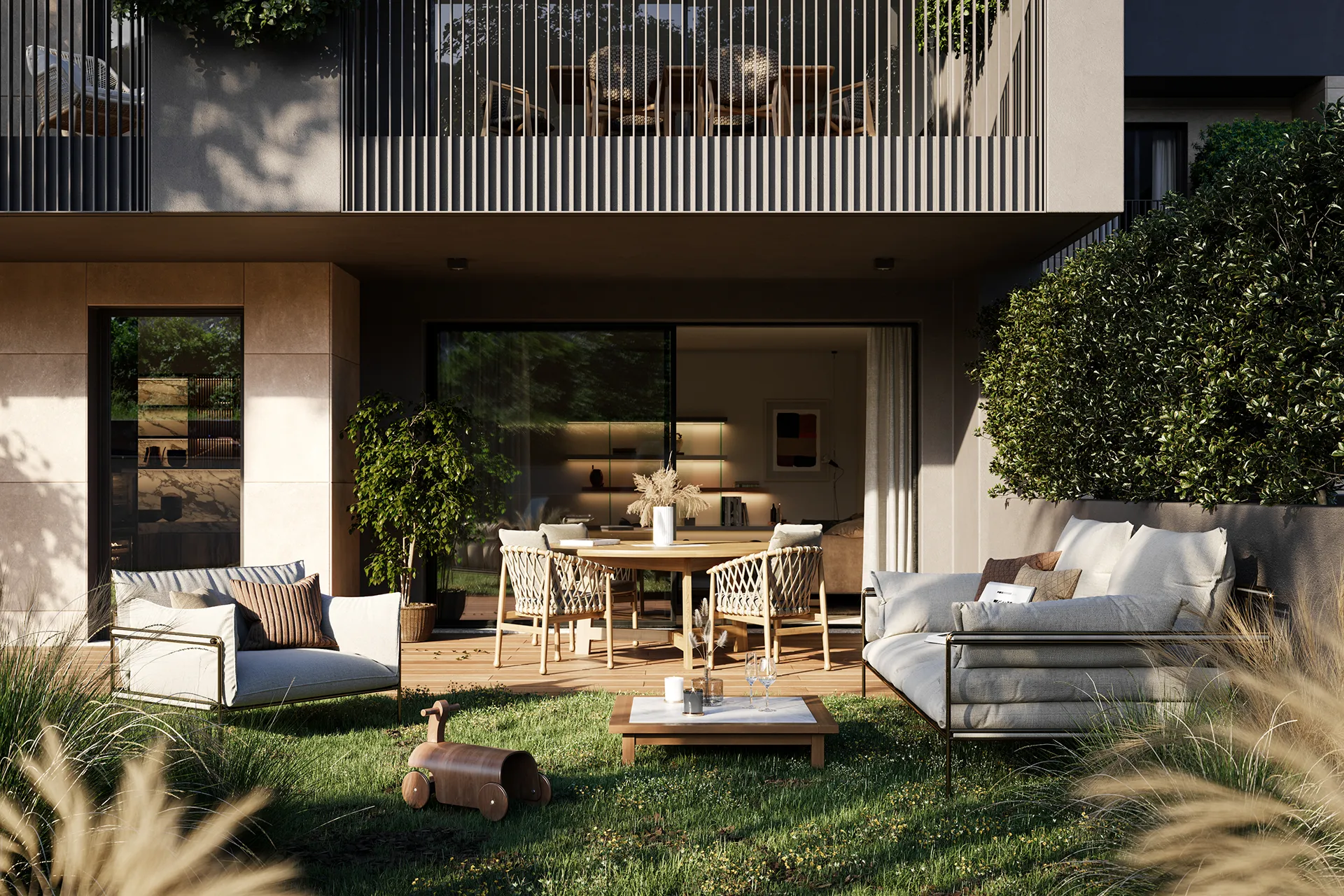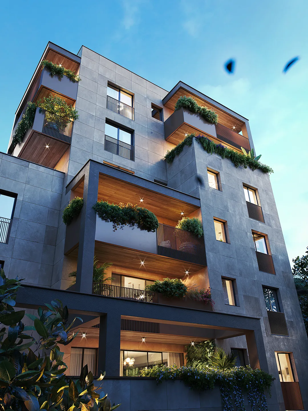 7 piani fuori terra ospitano 13 preziosi appartamenti in cui il rapporto con lo spazio esterno si traduce nella realizzazione di un volume composto, dove sbalzi e rientranze disegnano logge coperte, arredabili e abitabili come una vera e propria stanza in più.